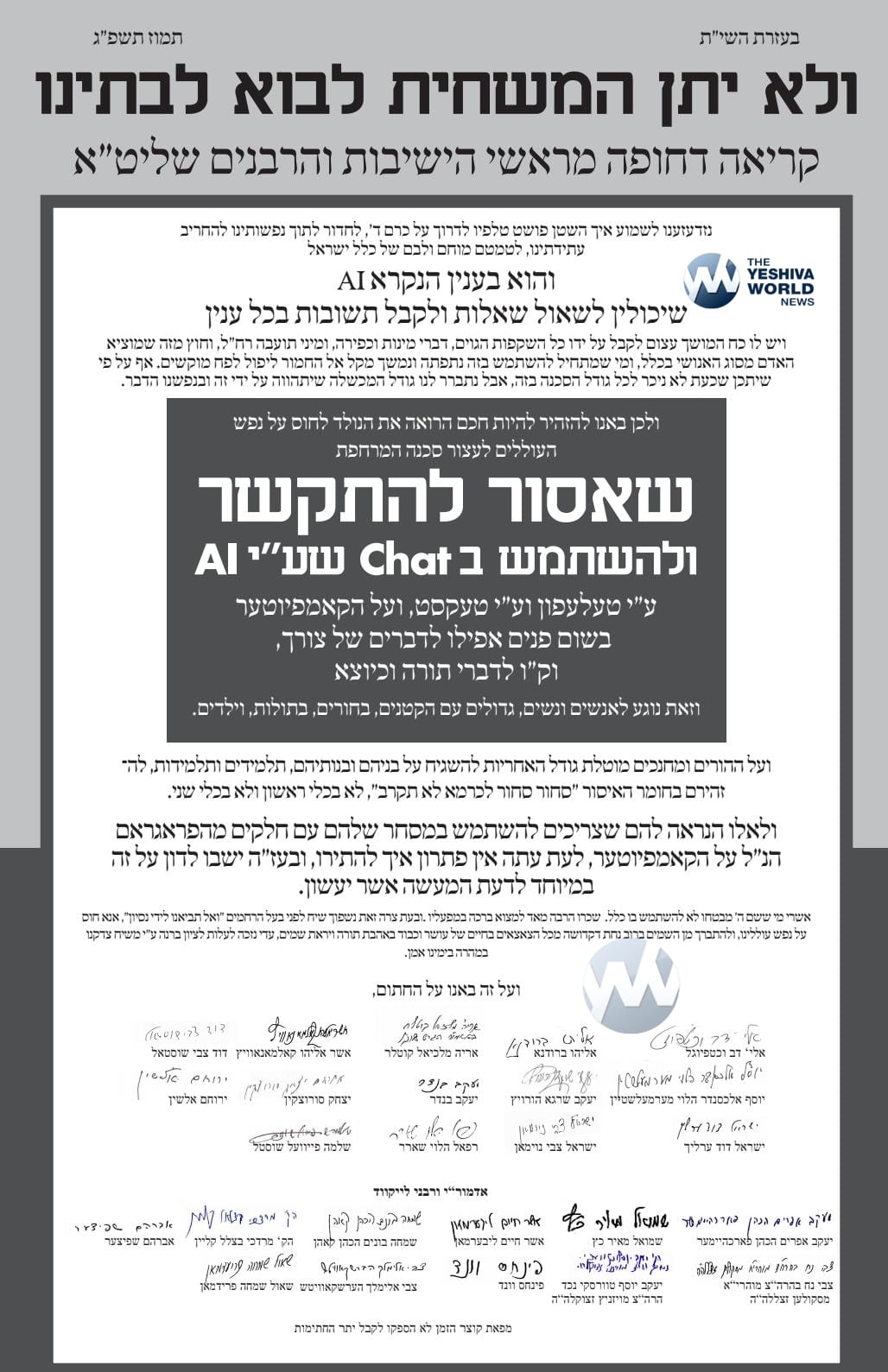 “Therefore,” the 25 rabbanim and roshei yeshiva write, “it is assur to connect with and use artificial intelligence chats, whether via a phone, text, or computer, even for a necessary use, and kal vachomer for divrei torah.”
