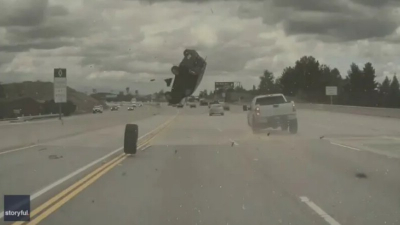 A dramatic car crash on a California freeway was caught on camera last week, showing a car flipping through the air after colliding with a tire that had become airborne.
