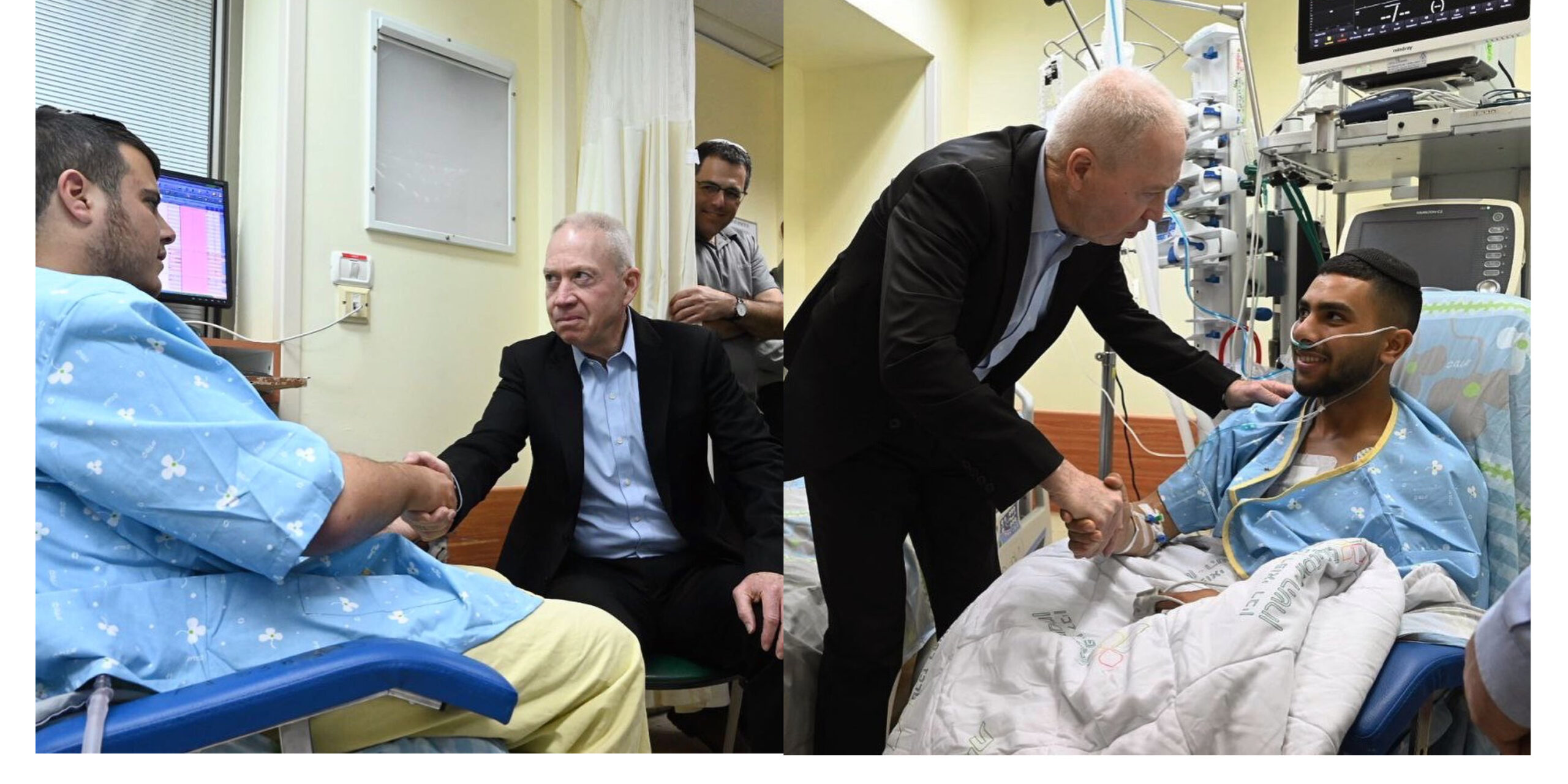Defense Minister Yoav Gallant on Sunday visited the two IDF soldiers injured in a shooting attack in Huwara on Shabbos in Beilinson Hospital in Petach Tikvah. The two soldiers, Elon