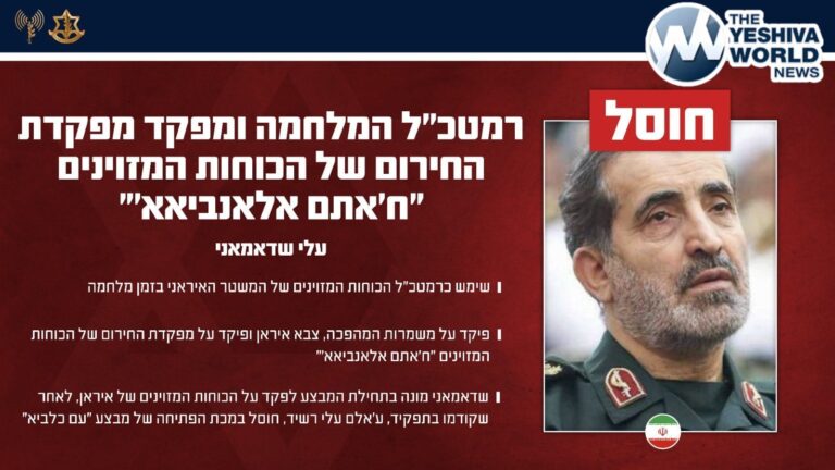 The IDF announced on Tuesday the elimination of Ali Shadmani, Iran’s War-Time Chief of Staff and the regime’s top military commander. According to the IDF, the strike was carried out