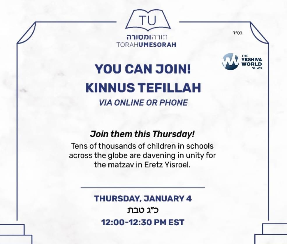 There will be a large Kinnus Tefillah taking place today, Thursday, January 4 at 12:00-12:30PM ET, via livestream. Tens of thousands of children in their schools across the globe will