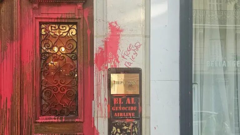 Pro-Hamas thugs vandalized the El Al office in Paris overnight Thursday, spraying the building with red paint and writing antisemitic statements, including “El Al: Genocide Airline” and “Free Palestine.” El