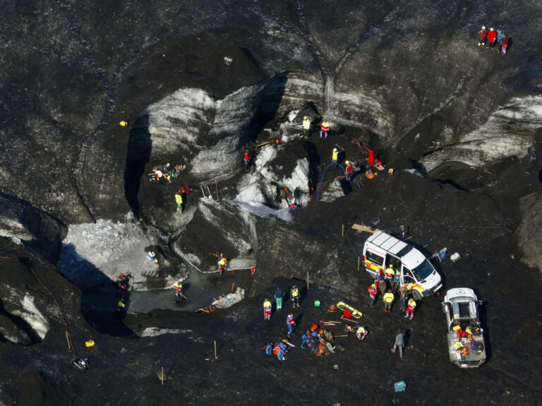 Icelandic rescuers worked by hand Monday to cut through the remnants of a collapsed ice cave as they searched for two tourists missing for more than 24 hours since a