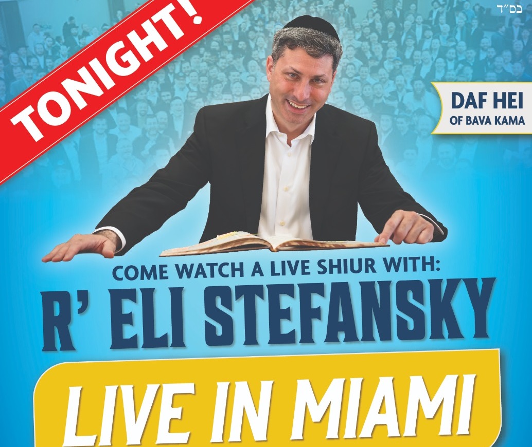 Famed Daf Yomi Maggid Shiur Reb Eli Stefansky will be giving shiur (Bava Kama Daf Hei) LIVE tonight from Miami at Ecore-23. (The shiur itself is open to the greater