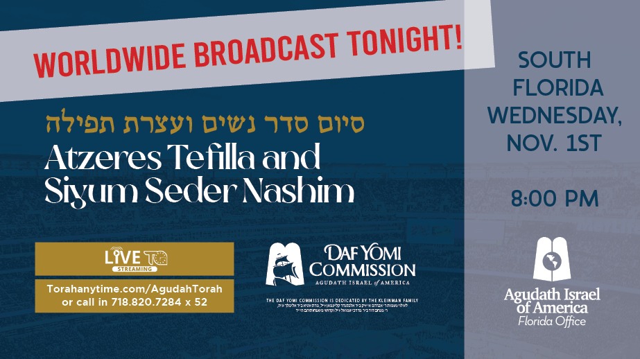 Tonight, Wednesday, November 1st י”ז חשון at 8:00 PM ET Lomdei HaDaf Yomi across the globe will begin celebrating Siyum Seder Nashim in the 14th cycle of Daf Hayomi. Agudas