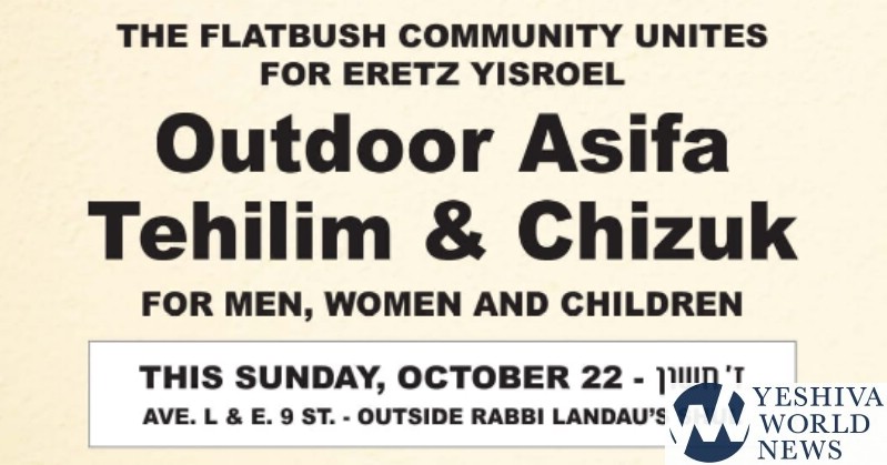 Flatbush Jewry is uniting in Tefillah to support our brothers and sisters in Eretz Yisroel this Sunday, October 22 at 2:00PM outside the centrally located Rabbi Landau’s shul, on Avenue