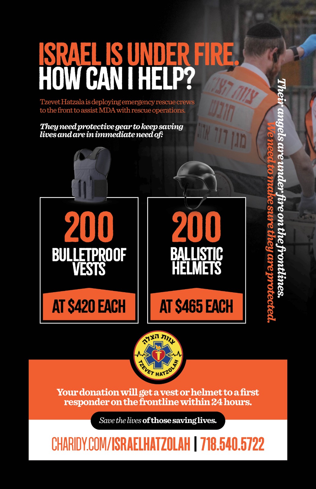 Tezvet Hatzalah Israel URGENT!!l CLICK HERE!!! 845-205-9911 We need IMMEDIATELY 200 Bulletproof Vests & Ballistic Helmets!! CLICK HERE!!! https://charidy.com/israelhatzolah?utm_source=36 Emergency Assistance!! Tzevet Hatzolah – MDA volunteers are responding to the