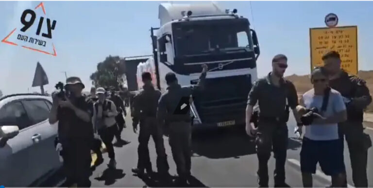 Activists from the Tzav 9 and The Reservists movements held a protest at the Kerem Shalom crossing on Wednesday morning, blocking access to humanitarian aid trucks on their way to