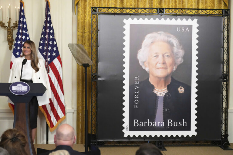 In the White House’s East Room on a rainy Thursday, first lady Melania Trump and members of the Bush family gathered to unveil a U.S postage stamp bearing the portrait