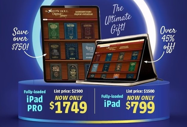 This weekend only, get a major discount with over 45% off ArtScroll’s pre-loaded iPad, containing the entire ArtScroll digital library – Chumash, siddur, Tanach, Talmud, Mishnah, Rashi and much more, all