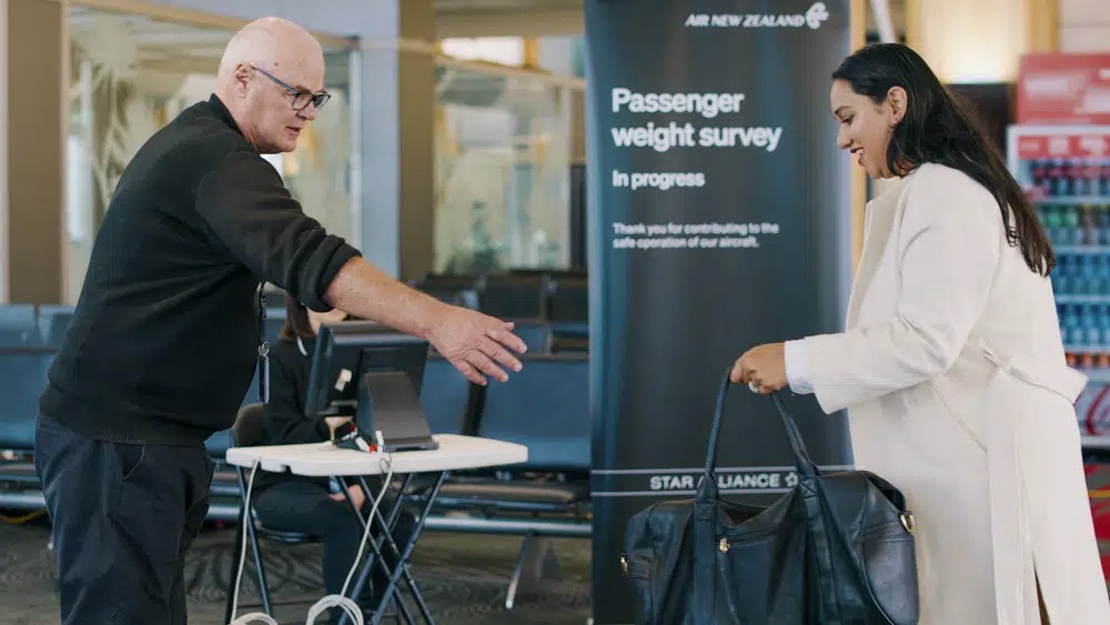 New Zealand’s national airline is asking passengers to step on the scales before they board international flights. Air New Zealand says it wants to weigh 10,000 passengers during a monthlong