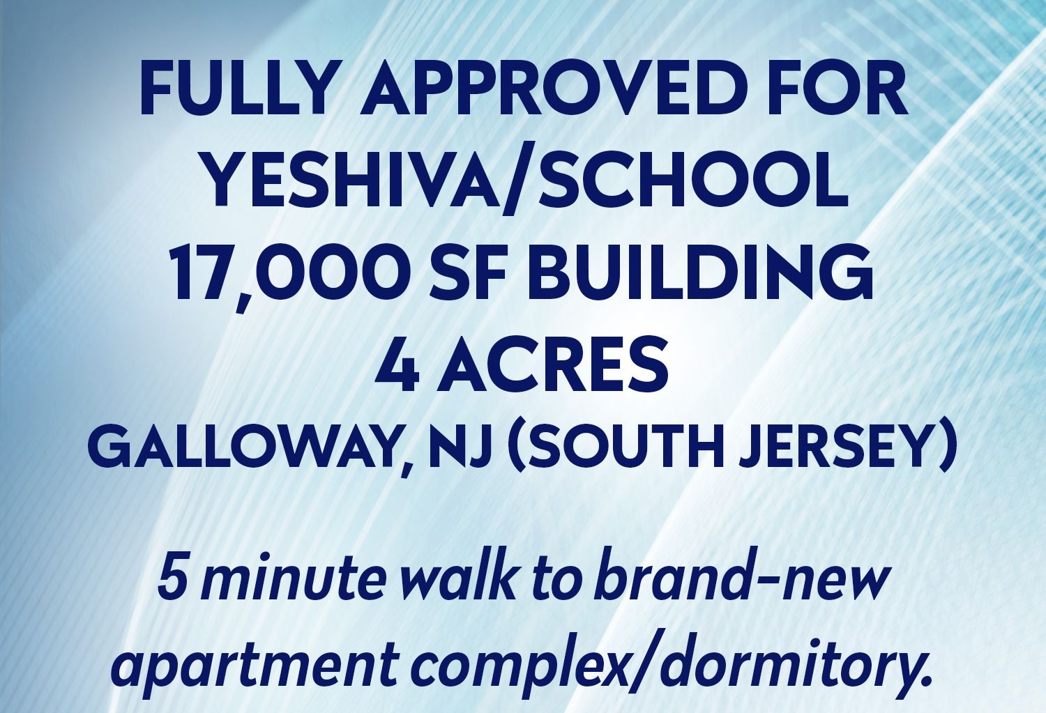 In South NJ, (Galloway) stands a property of 4 acres and a 17,000 square foot building. This building/property has already been approved for a Yeshiva/School. Something like this does NOT