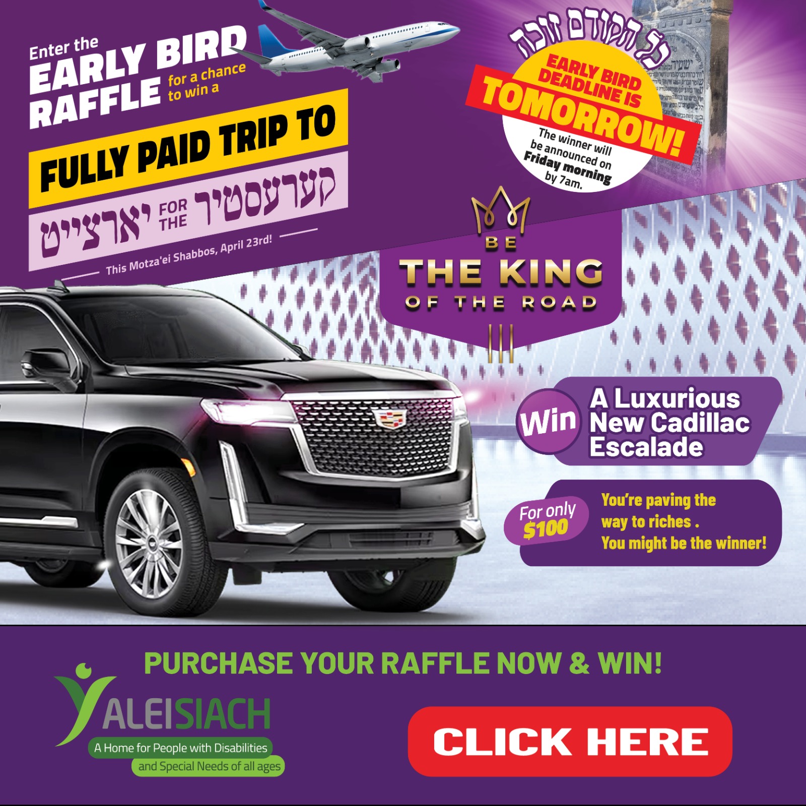 !!!כל הקודם זוכה – WIN A Trip to Kerestir for the יארצייט!!! TOMORROW!! And WIN Brand-New Cadillac Escalade!!! CLICK HERE FOR A CHANCE TO WIN! CLICK HERE FOR A CHANCE