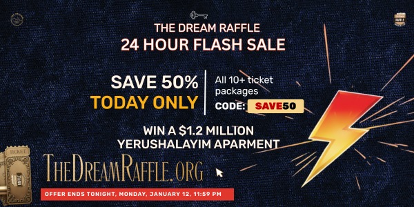 TODAY ONLY! – MONDAY MADNESS FROM THE DREAM RAFFLE! SAVE 50% OFF TODAY ONLY!! For ALL Packages of 10 Tickets and Above! Win A $1.2 Million Apartment In Yerushalayim! Use Code: SAVE50 SAVE
