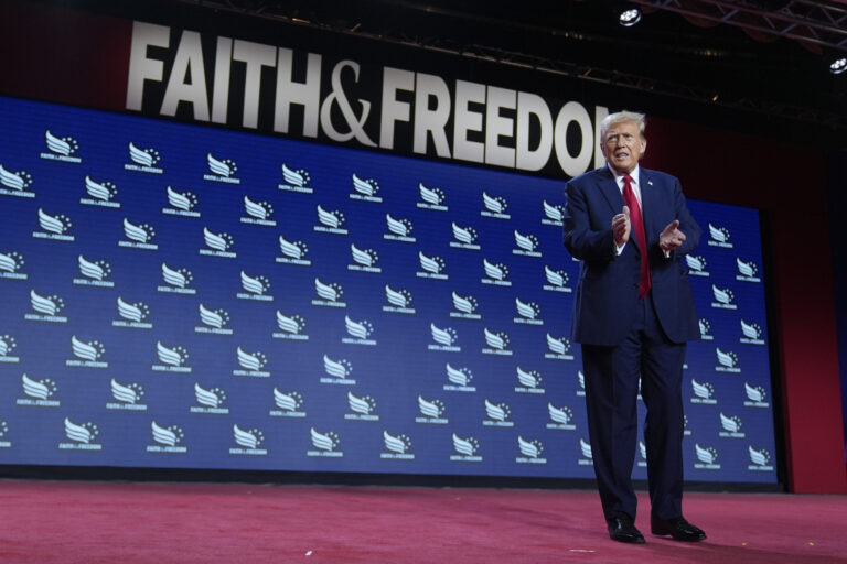 Donald Trump told a group of evangelicals they “cannot afford to sit on the sidelines” of the 2024 election, imploring them at one point to “go and vote, Christians, please!”