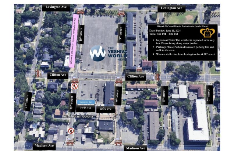 The major asifah in Lakewood with six leading gedolei yisroel from Eretz Yisroel will take place from 7 to 8 PM Sunday evening at the parking lot adjacent to BMG’s