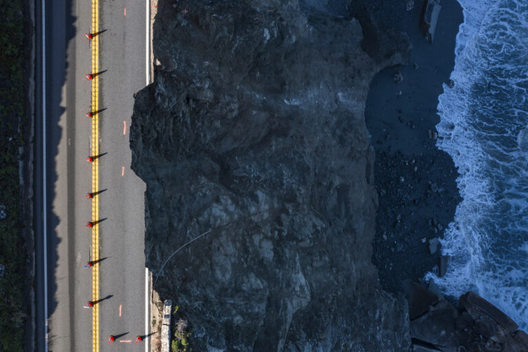 Motorists crept along one lane of a scenic stretch of California’s iconic Highway 1 on Monday after a giant chunk of it collapsed into the ocean following heavy weekend rains,