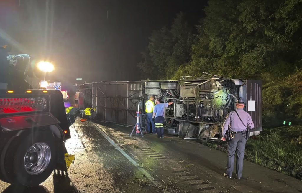 A charter bus carrying up to 50 people collided with a vehicle on an interstate in Pennsylvania killing three people, state police said. The crash happened during heavy rain around