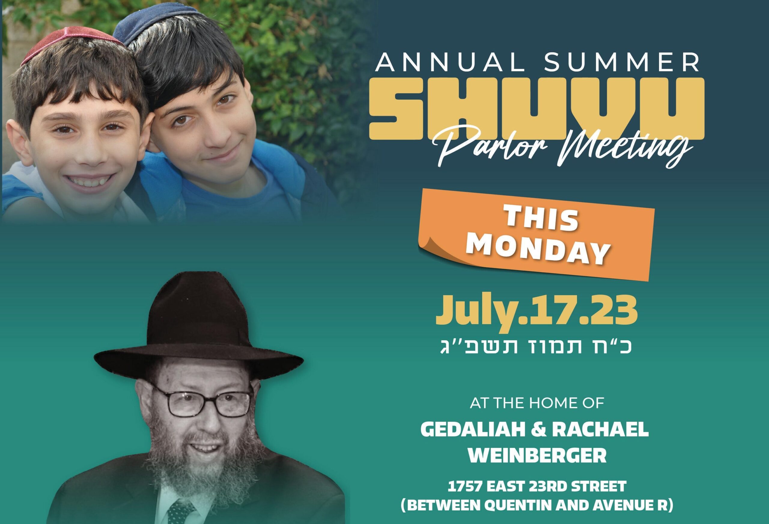 Tonight, Monday night, July 17th, Rabbi Yissocher Frand will be coming to Brooklyn as the keynote speaker for Shuvu’s Summer Parlor Meeting. The annual event, which will Be’H take place