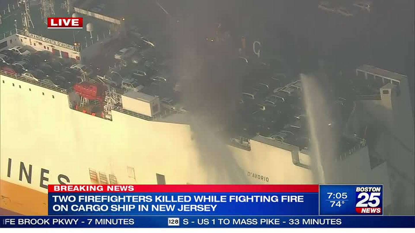 Two firefighters were killed and five others injured battling a blaze that began deep inside a docked cargo ship carrying more than a thousand vehicles, officials said Thursday. Responding firefighters