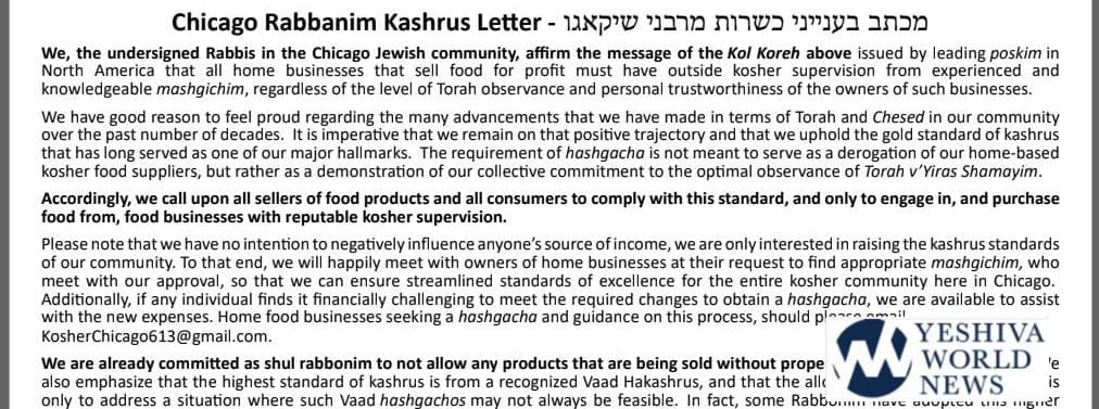 Nearly all Rabbonim in Chicago have issued a message to its Community, to only engage in and purchase food from, home businesses with reputable kosher supervision. This proclamation follows the