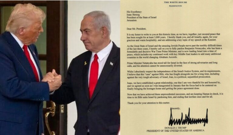 President Isaac Herzog received an official letter from U.S. President Donald Trump on Wednesday morning, calling on him to grant a pardon to Prime Minister Binyamin Netanyahu. Trump wrote that