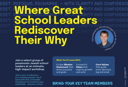 On May 7th, join a select group of passionate Jewish school leaders at an intimate high-impact workshop. What You’ll Leave with:– A clear Mission Statement that drives purpose and goals.–