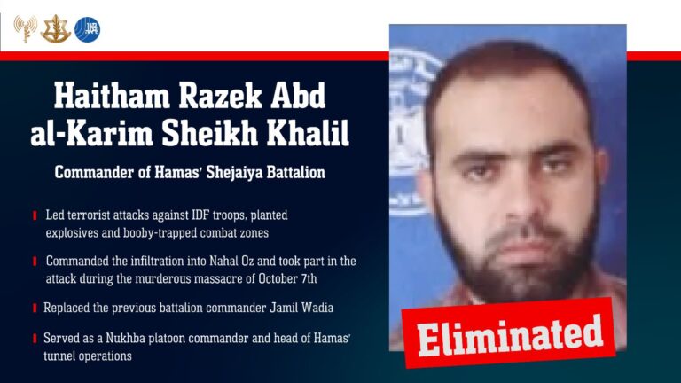 The IDF and Shin Bet confirmed Thursday that Haytham Sheikh Khalil, commander of Hamas’s Shuja’iyya Battalion, was killed in an airstrike on a Hamas command center in Gaza City. Khalil