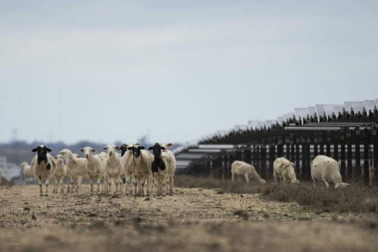 On rural Texas farmland, beneath hundreds of rows of solar panels, a troop of stocky sheep rummage through pasture, casually bumping into one another as they remain committed to a