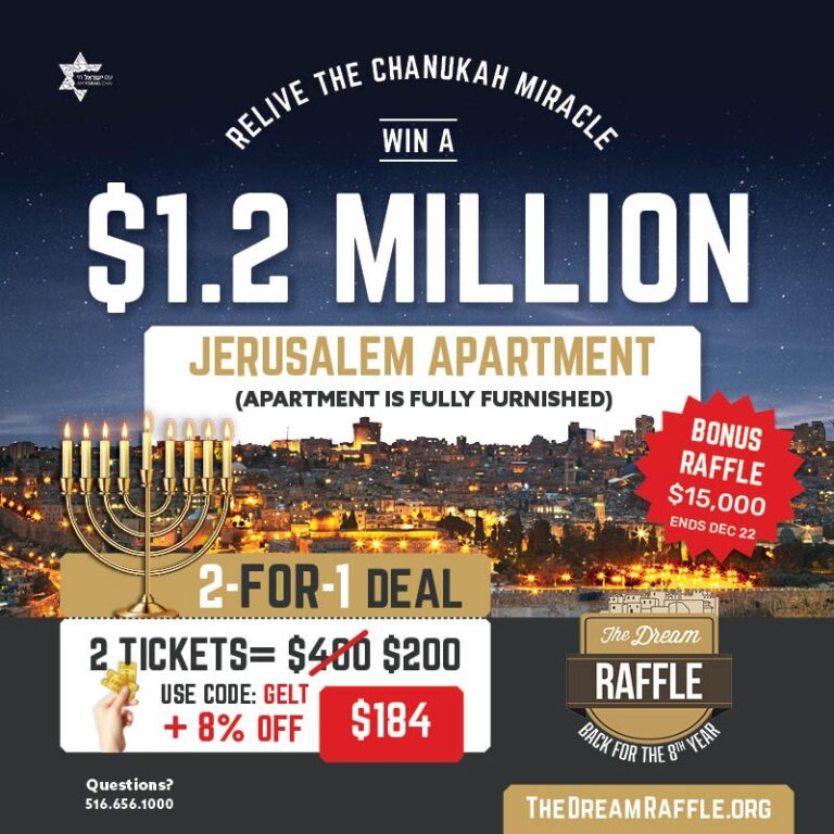 FEW HOURS LEFT to our Bonus Raffle! Win a $1.2 million apartment in the heart of the Holy City with the 8th annual Dream Raffle Special Chanukah Deal: All tickets are 2-for-1!
