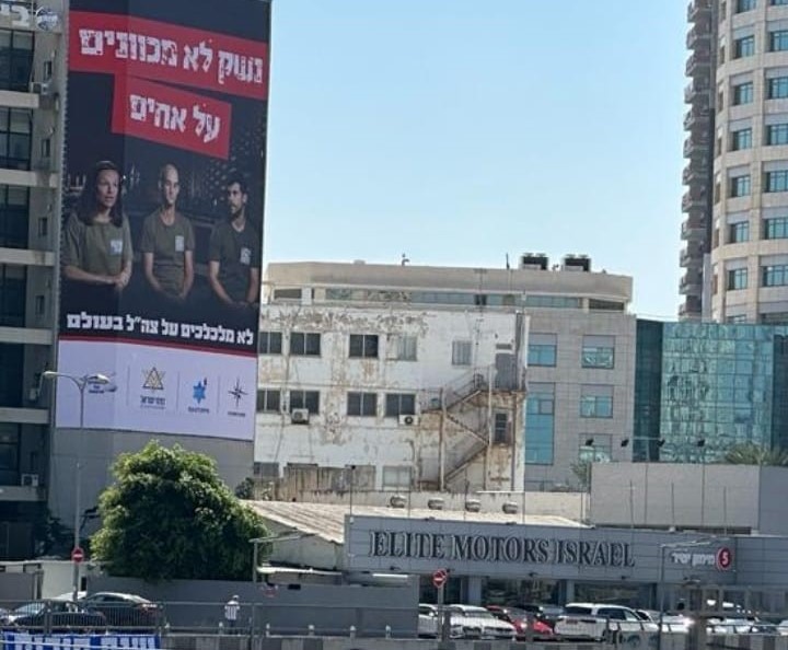 A huge billboard with a screenshot of the three Achim B’Neshek [Brothers In Arms] members who slandered Israel and the IDF on 60 Minutes, was hung over the Ayalon Highway