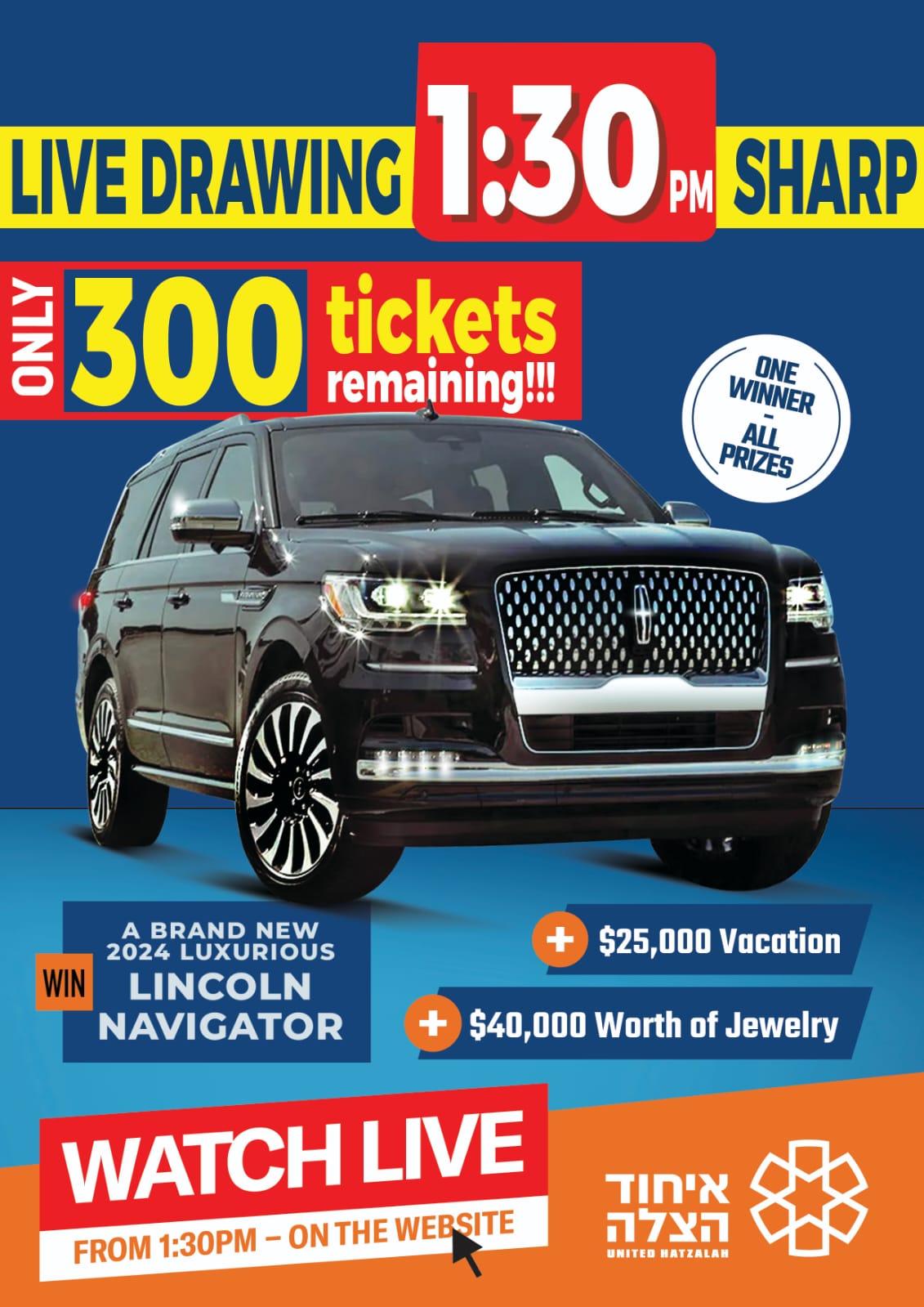 *LIVE DRAWING!! 1:30PM* *_Only 300 Tickets LEFT!!!_* Click Here NOW! http://hatzalahraffle.com/?af=is36 *HELP UNITED HATZALAH!!* Win 2024 Luxurious Lincoln Navigator + $25k vacation + 40k Jewelry!!! *Buy a ticket NOW:* Click Here