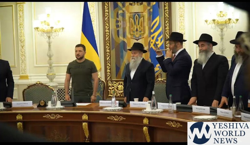 Ukrainian President Volodymyr Zelensky met with 32 Chabad shlichim and Rabbanim in his office on Thursday in a special event ahead of Rosh Hashanah. It was the first time such