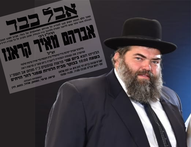 An especially difficult tragedy: HaRav HaGaon R’ Avraham Meir Kranz was niftar suddenly at the age of only 56* He left behind 11 orphans, six of whom are yet unmarried*