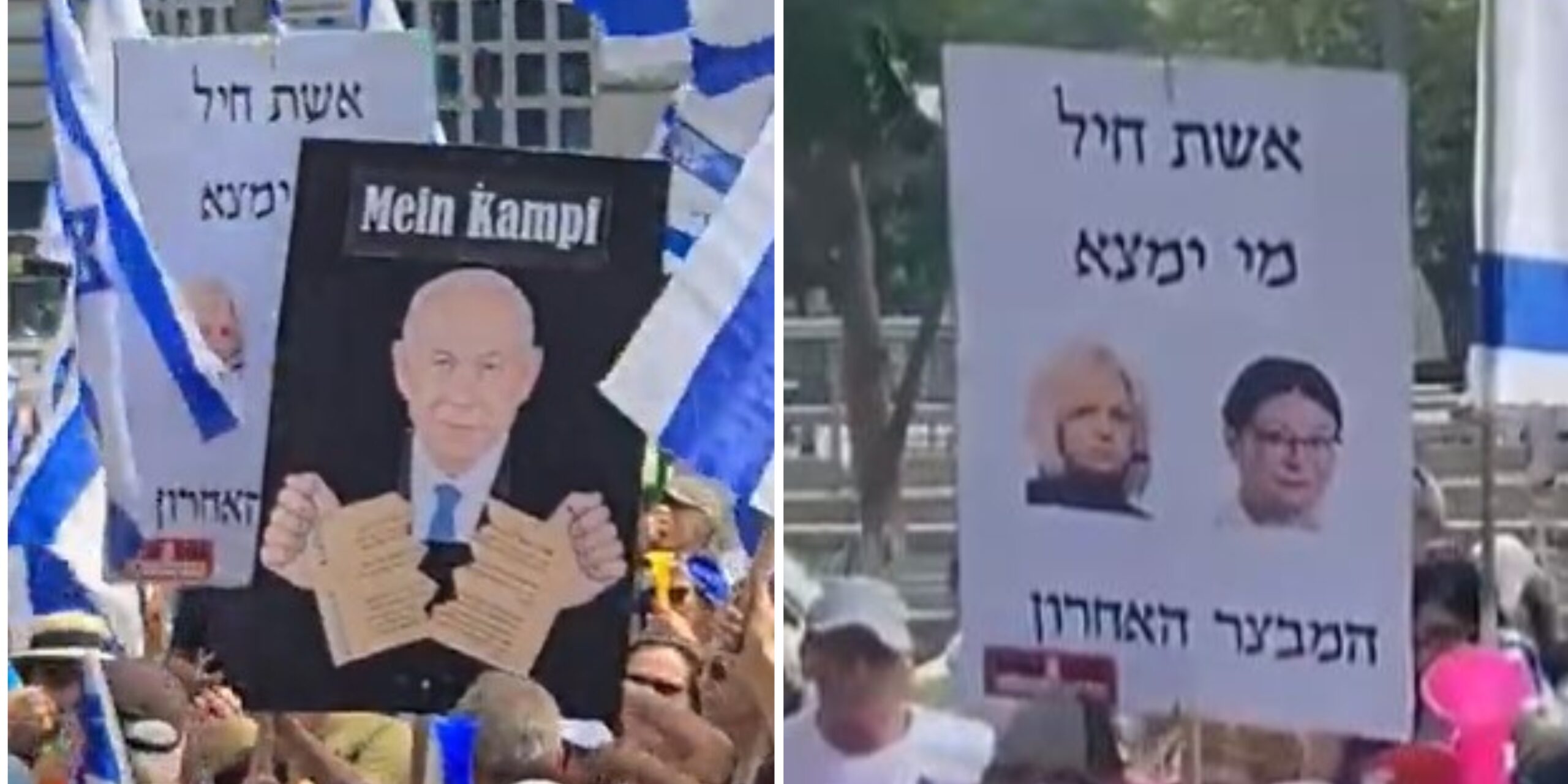 A leftist held a sign with a photo of Prime Minister Binyamin Netanyahu under the words Mein Kampf, the book written by Nazi leader Adolf Hitler, at a protest on