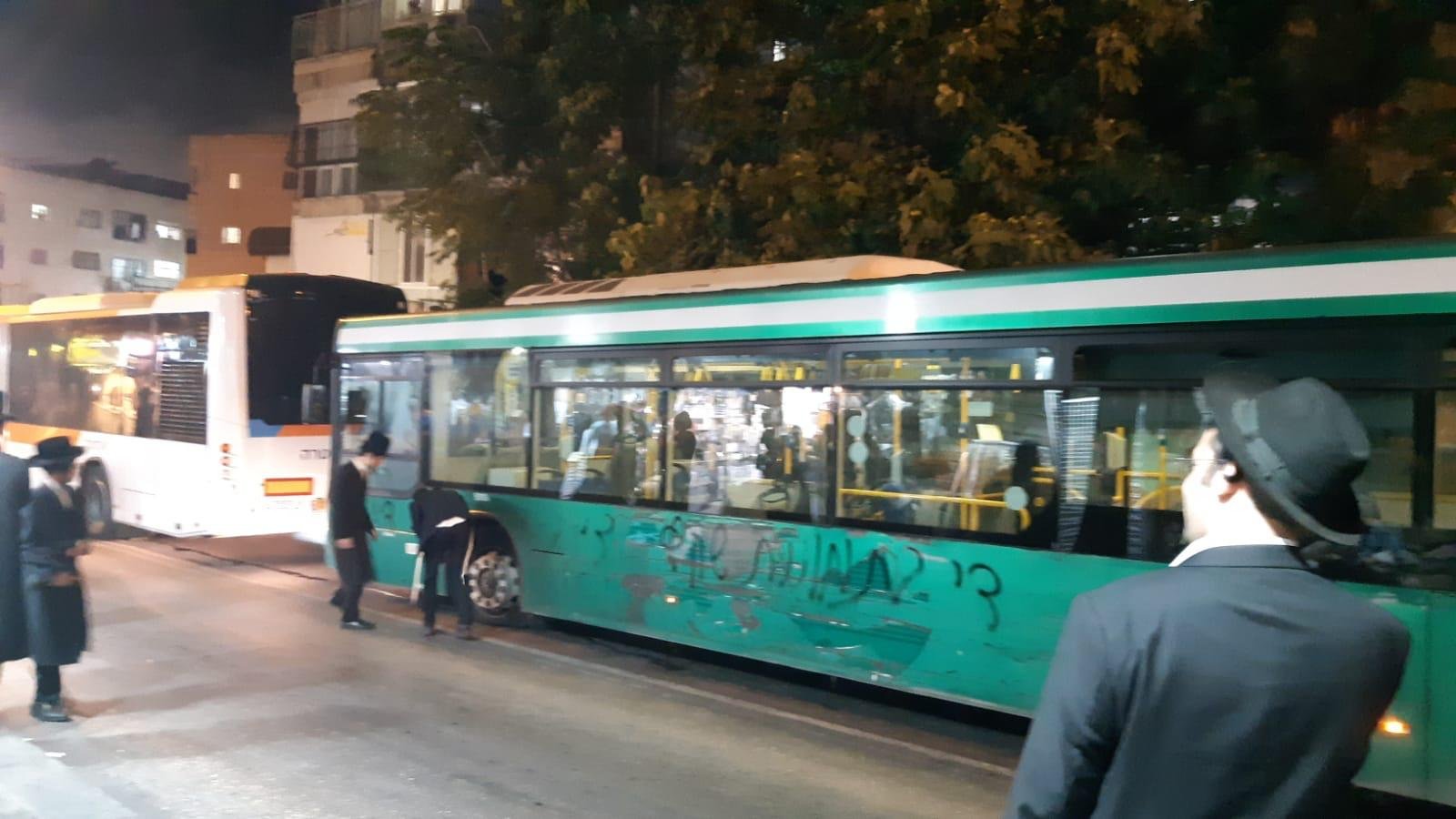 Radical chareidi extremists have struck again in the heart of Yerushalayim, with a group of the zealots puncturing the wheels of Egged buses and spray-painting them with messages reading, “Enough