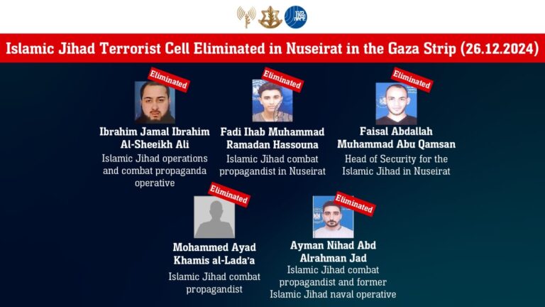 In a coordinated overnight operation, the IDF and Shin Bet targeted and eliminated a cell of Islamic Jihad terrorists in the Nuseirat area of Gaza. The precise strike, conducted by