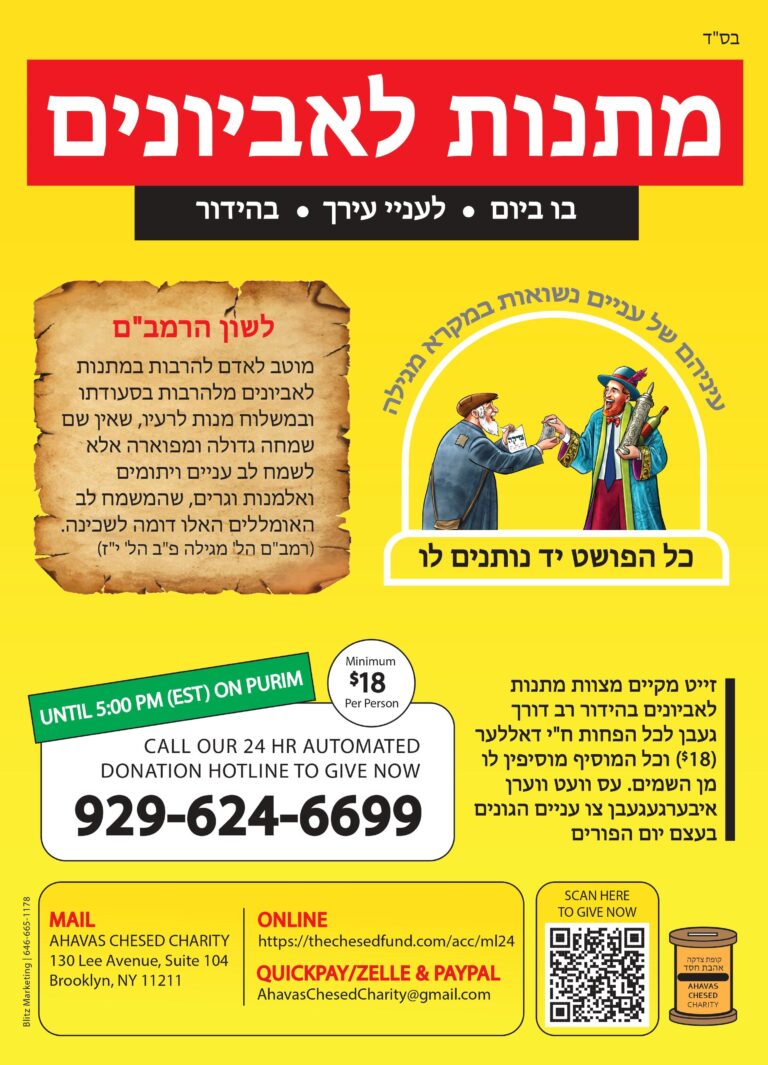 נדיבי העם אחינו כל בית ישראל רחמנים בני רחמנים Dear Brothers and Sisters, This Purim be מקיים the great מצוה of מתנות לאביונים in its highest and best form by
