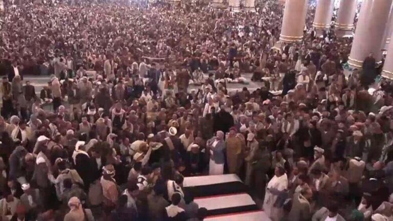 The Houthis in Yemen held a mass funeral in Saana on Monday morning for Prime Minister Ahmed A-Rahawi and almost all the members of the Houthi cabinet who were eliminated