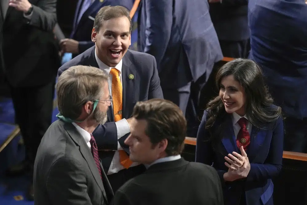 Republican Rep. George Santos positioned himself in a prime location for President Joe Biden’s State of the Union address — an uncomfortably prominent place for the embattled new lawmaker who