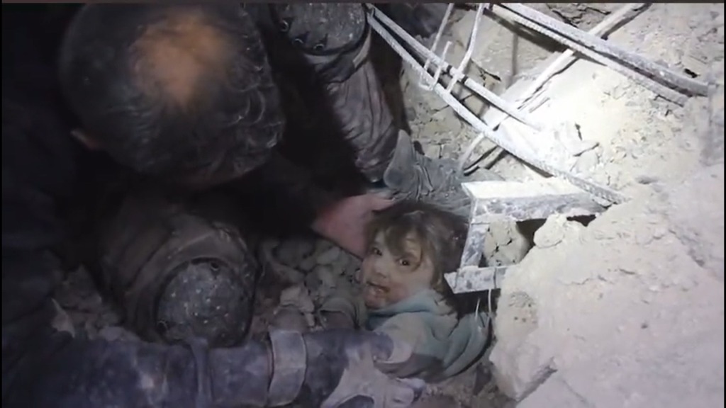Dramatic footage has emerged showing the moment rescue workers pulled a toddler covered in blood from under the rubble in the northwest Syrian city of Jinderis. The dramatic rescue too