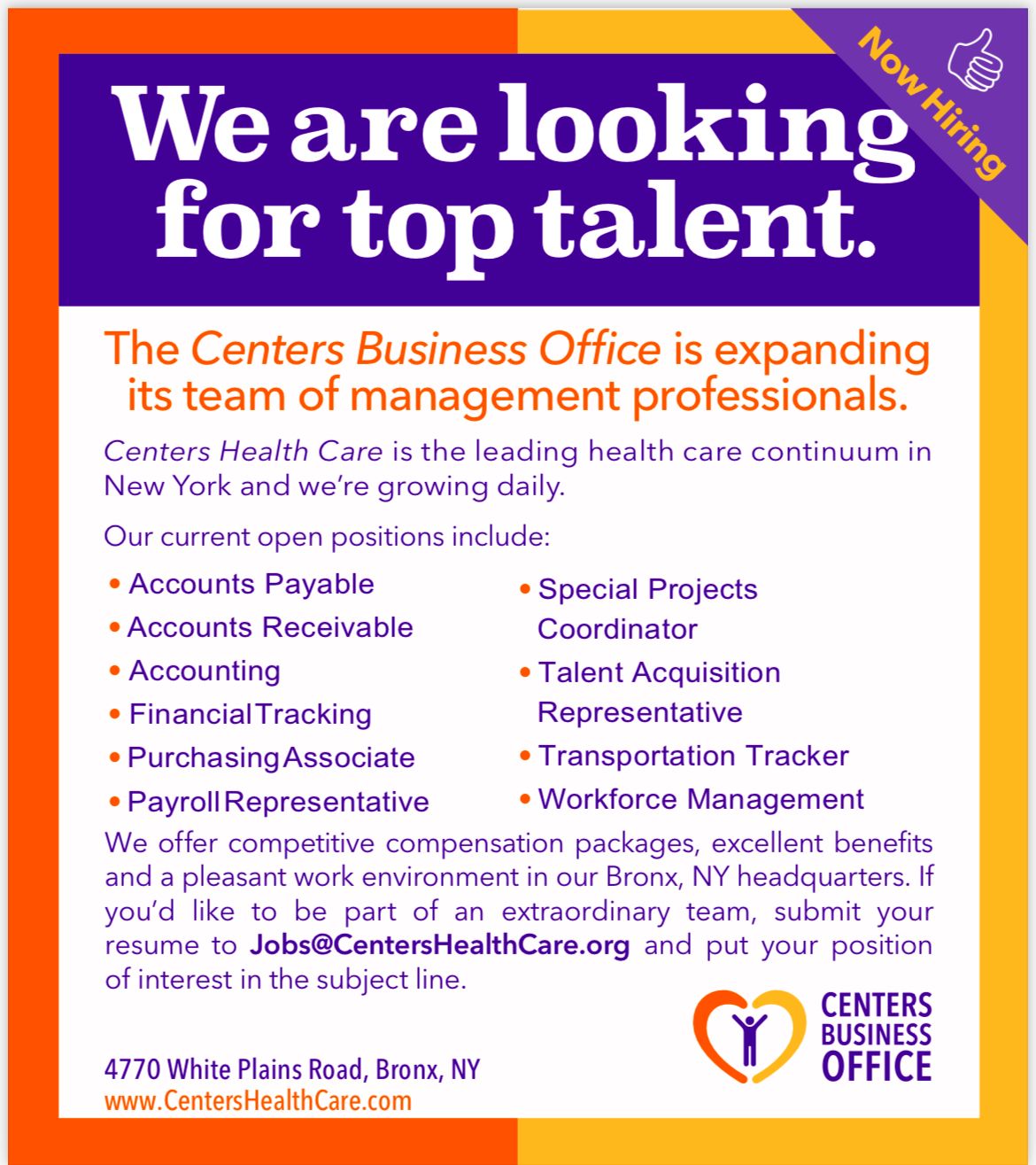 Centers Health Care is looking for Entry and Mid level Talent, and provides training on the Job. Some of the Benefits include: Religious Environment, Generous Bonuses, Flexible Fridays, Great PTO