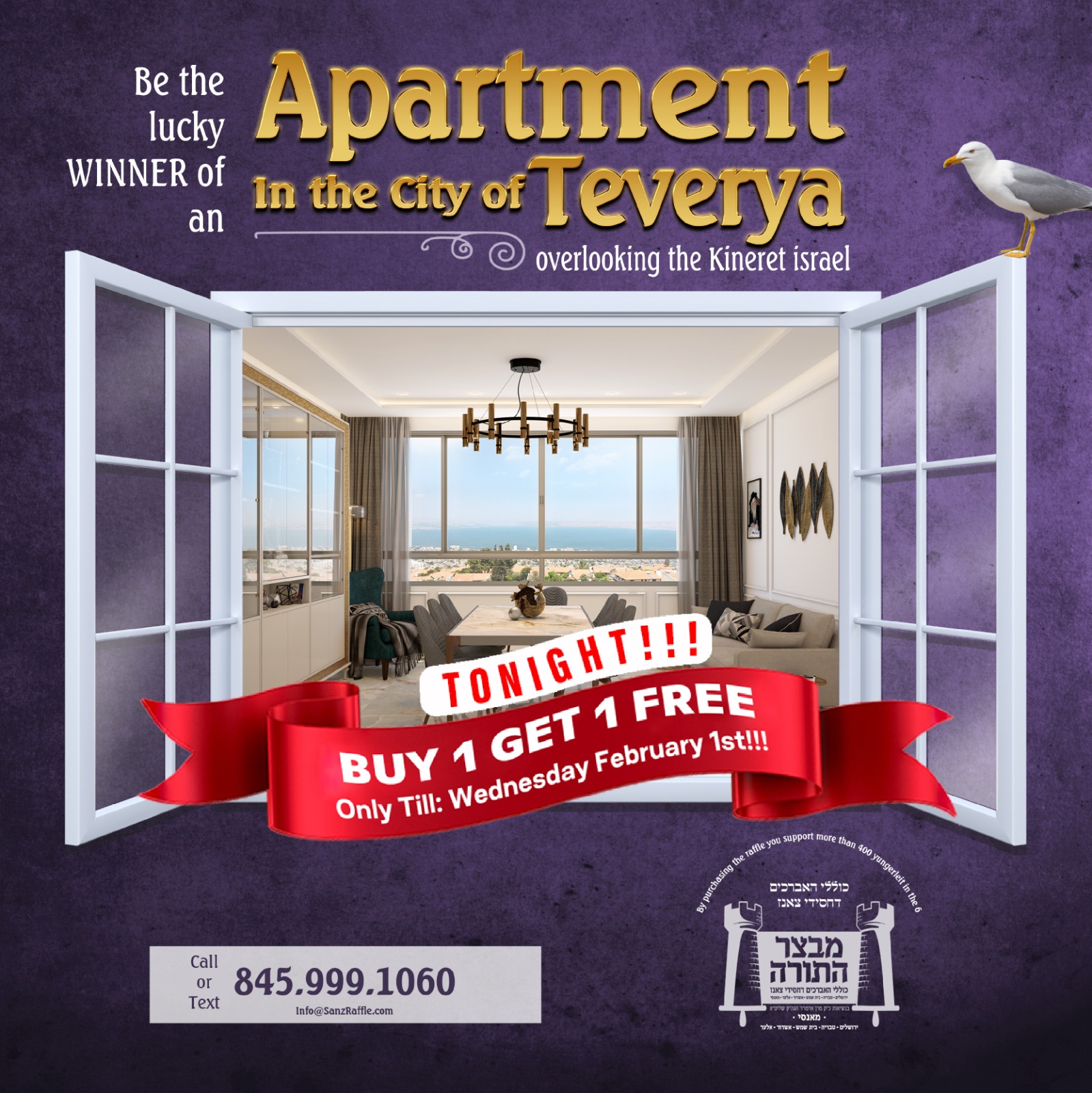 Buy 1 Get 1 FREE!! Deadline TONIGHT!!! Win Apartment in Teverya Israel CLICK HERE FOR A CHANCE TO WIN! CLICK HERE FOR A CHANCE TO WIN!