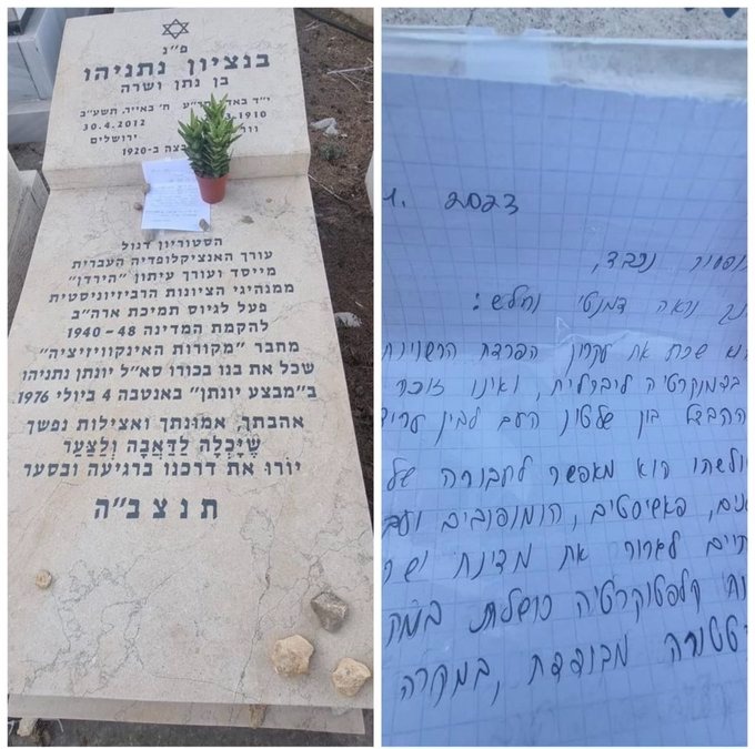 Family members of Prime Minister Binyamin Netanyahu who visited the kever of their father, historian Bentzion Netanyahu, z’l, at Har Hamenuchot on Friday were shocked to discover a hate letter