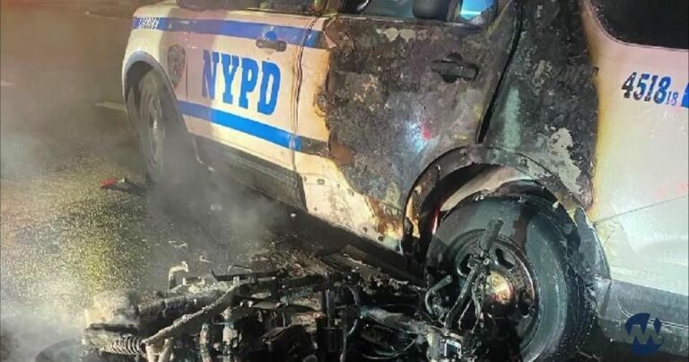 A man fleeing from the cops got more than he bargained for when the moped he was piloting crashed into a police cruiser, sending him flying and causing the vehicle