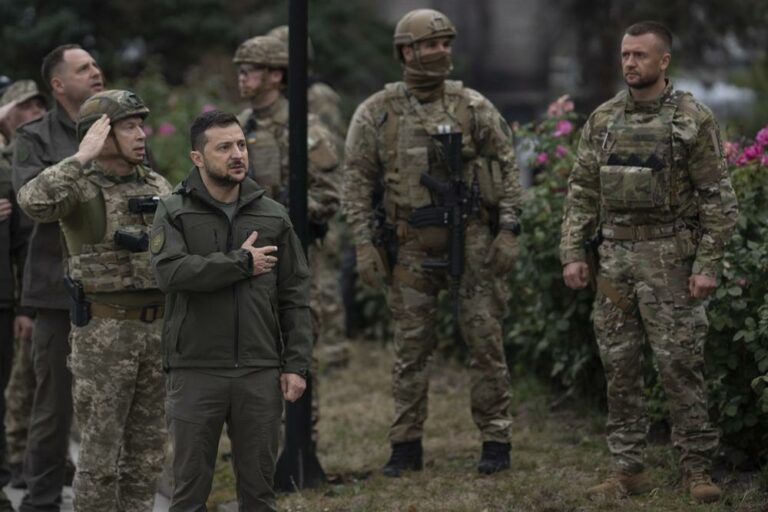 His hand on his heart, Ukrainian President Volodymyr Zelenskyy watched as his country’s flag was hoisted Wednesday above the recently recaptured city of Izium, a rare foray outside the capital