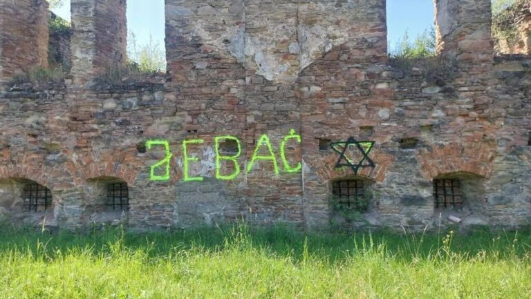 Two Jewish heritage sites in the southeastern Polish town of Dolka were defaced over the weekend with anti-Israel graffiti and Nazi swastikas. The vandalism targeted the ruins of a shul
