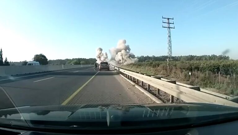 A car driving on Highway 70 during one of the Hezbollah rocket barrages at northern Israel on Tuesday morning caught dramatic footage of rocket explosions. As the siren blared and