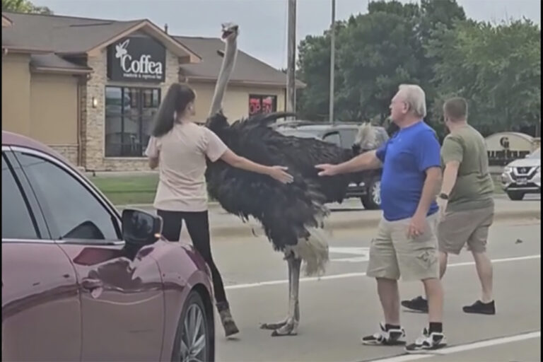 An ostrich brought traffic to a halt in Sioux Falls, South Dakota, on Tuesday as motorists tried to lure and nudge the towering bird off a multilane thoroughfare. Drivers called