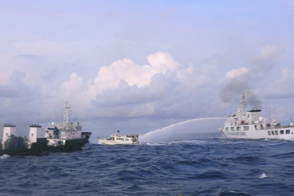 The Chinese coast guard targeted Philippine vessels with water cannon blasts Sunday and rammed one of them, causing damage and endangering Filipino crew members off a disputed shoal in the